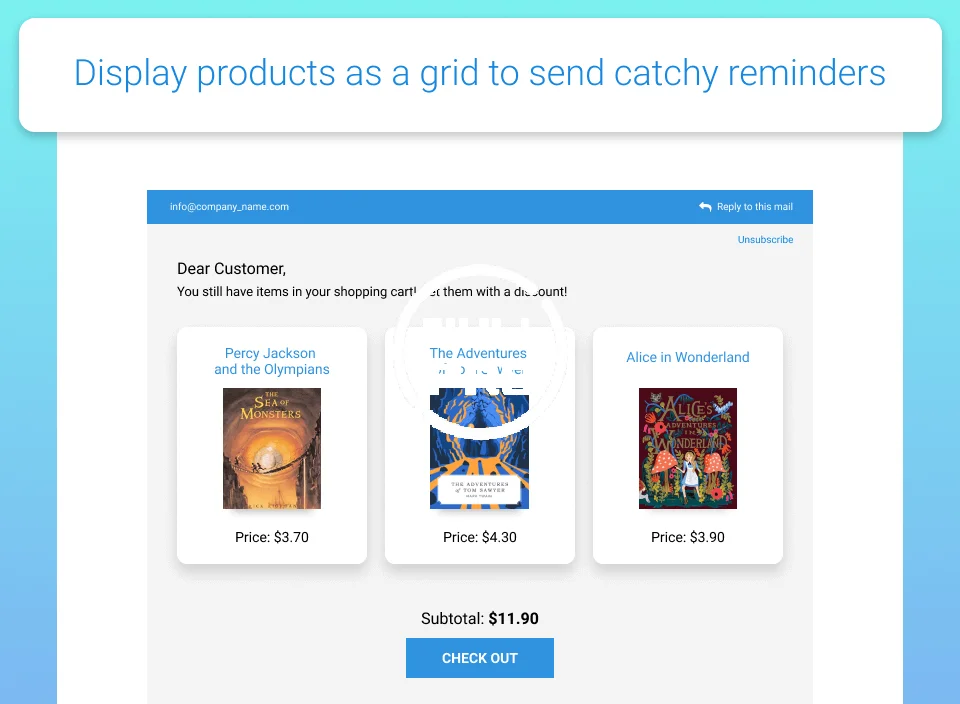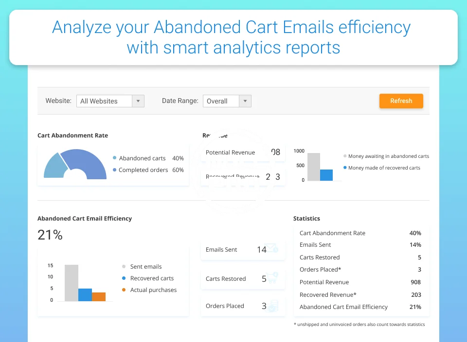 Augment sales revenue by the increased number of completed orders. Return lost revenue by automatically sending catchy reminders. Enhance customer loyalty by offering discount coupons.