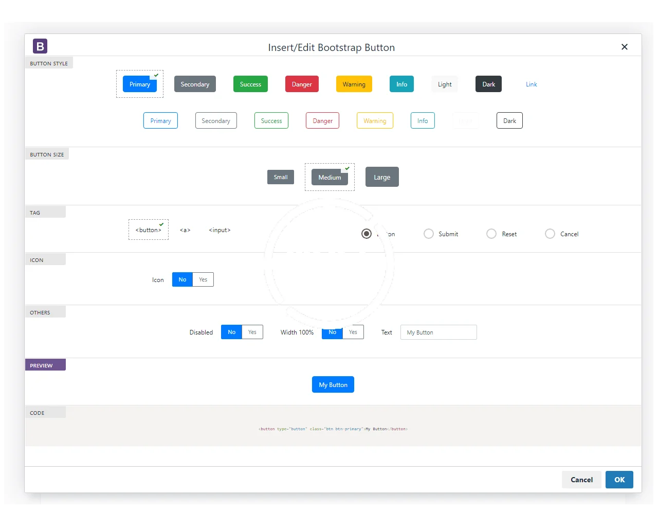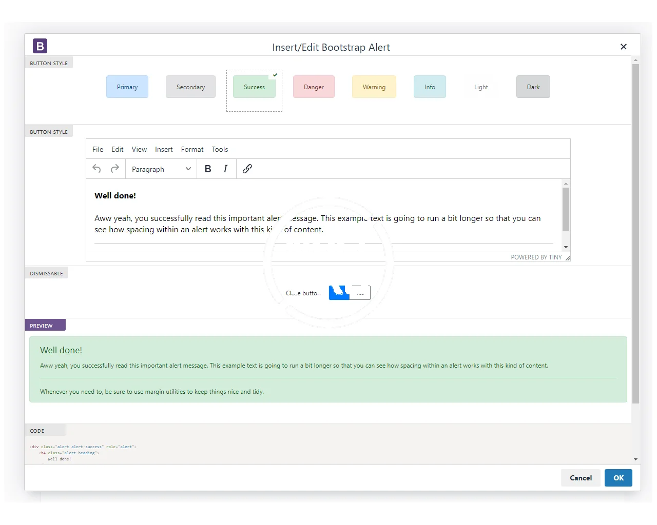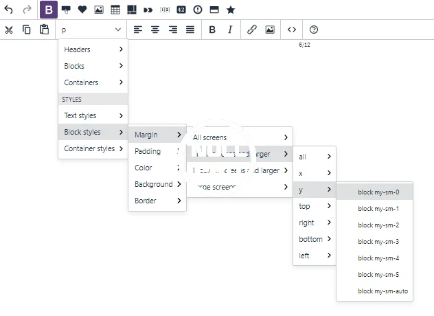 Bootstrap plugin for TinyMCE adds several new features to the editor:- A Bootstrap 4 toolbar