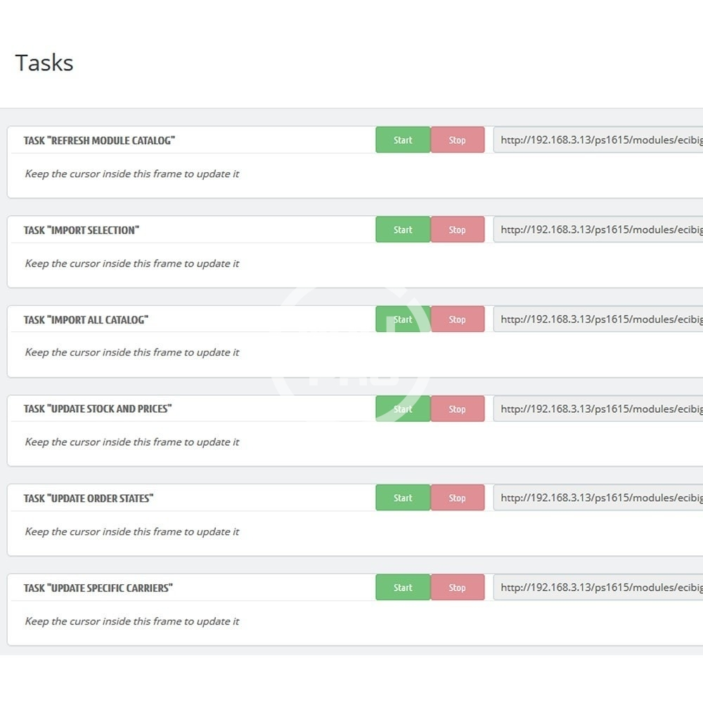 Different tasks are available such as synchronization of selected products, stock / order update. These tasks can be executed automatically (cron) thanks to the supplied urls.