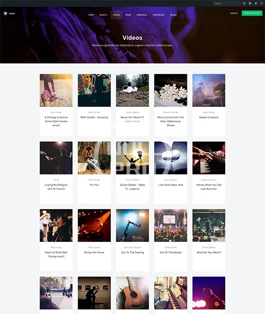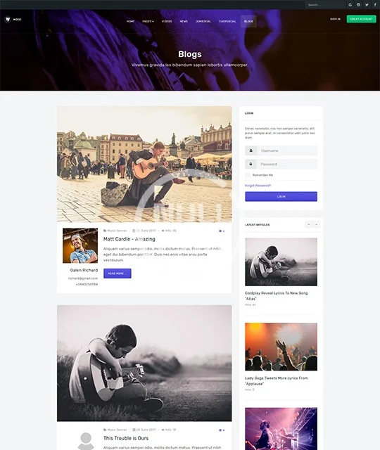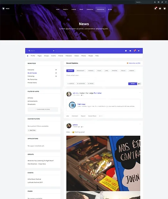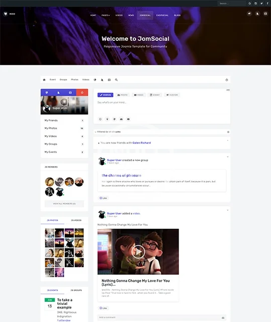 Music, community, social network Joomla template - JA Mood fully supports JomSocial and EasySocial component. JA Mood comes with creative design, integrates JA Joomla page builder to create landing pages, outstanding pre-made additional pages: Videos, News, Blog and support all Joomla default pages with customized styles.