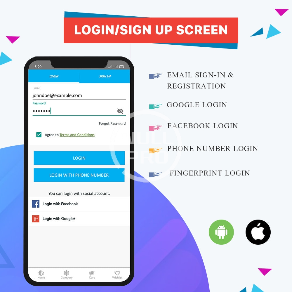 Instant Login Options: Nowadays, the login screen of your app plays a vital role in compelling users to open your app. The PrestaShop Mobile App Maker offers quicker & easier Google, Facebook, OTP & Fingerprint login options in the mobile app.