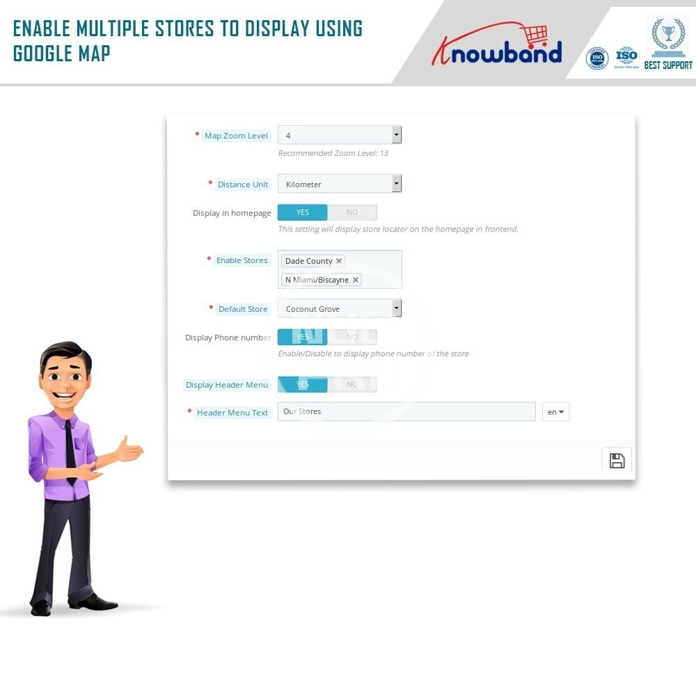 - The store owner can set an image as Google map marker and zoom level of the map.