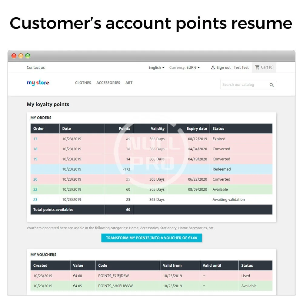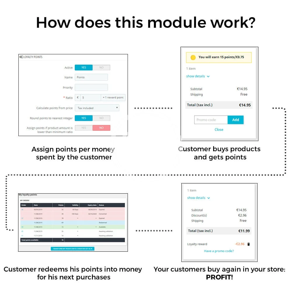 This module allows you to create a points program to build strong relationships and loyalty with your customers. Your customers will accumulate loyalty points for their orders, which they can use later as a discount on their next purchases.