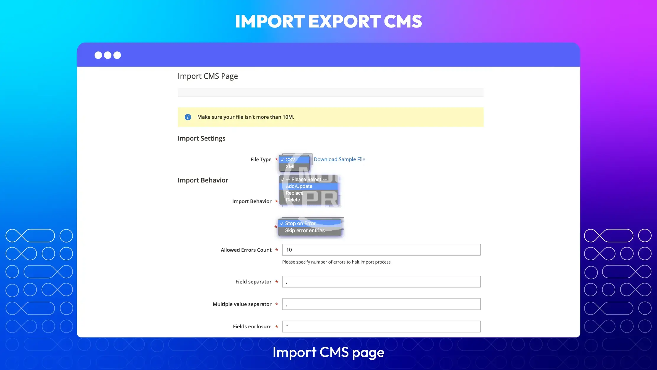 • Import CMS Pages/Blocks via CSV or XML files