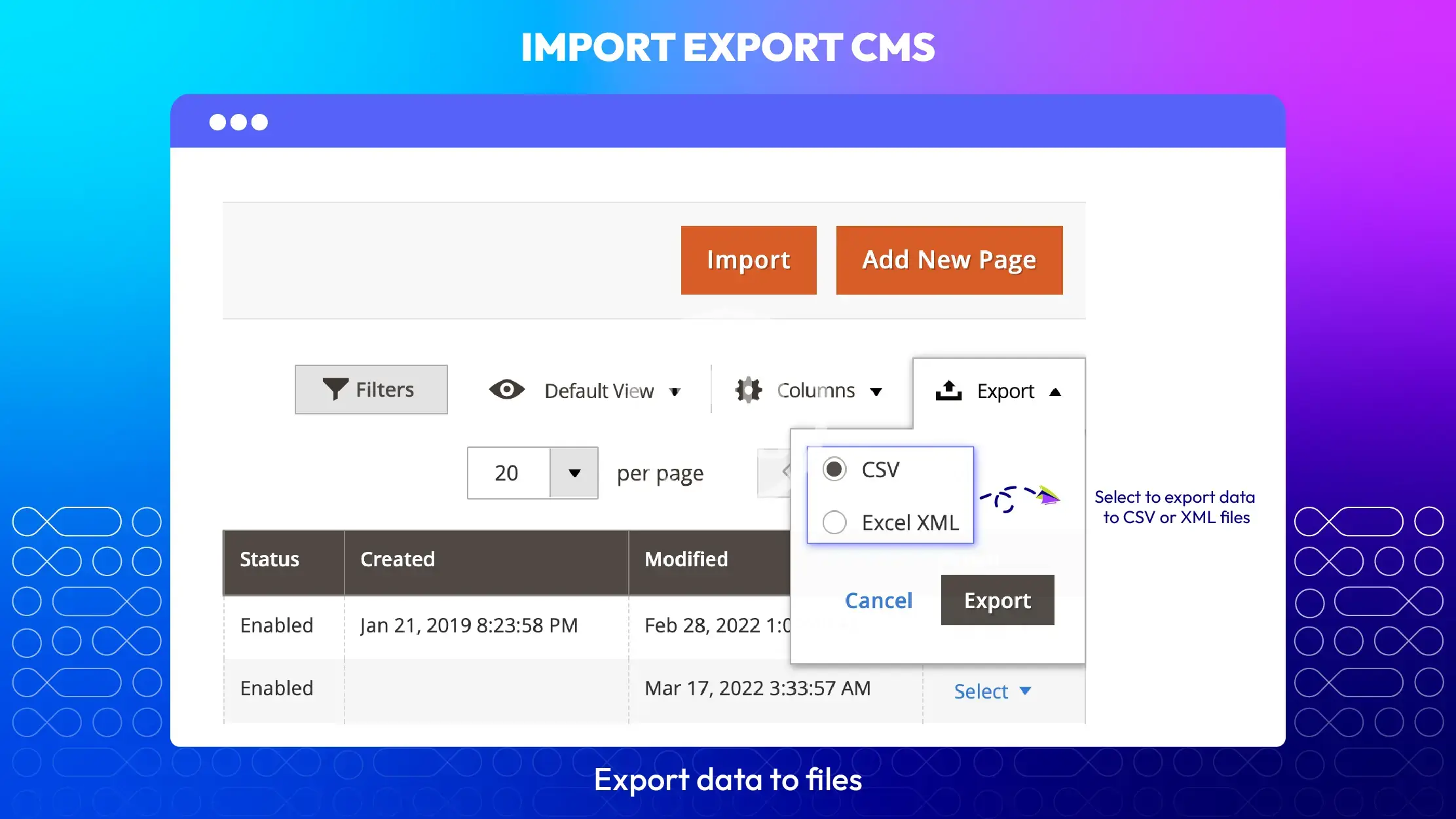 Magento 2 Import Export CMS extension help assists transfer data of CMS Pages/Blocks from M1 site to M2 site or Magento 2 to any other data sources easily. This simplifies the data-update process of online stores to become faster and more effective.