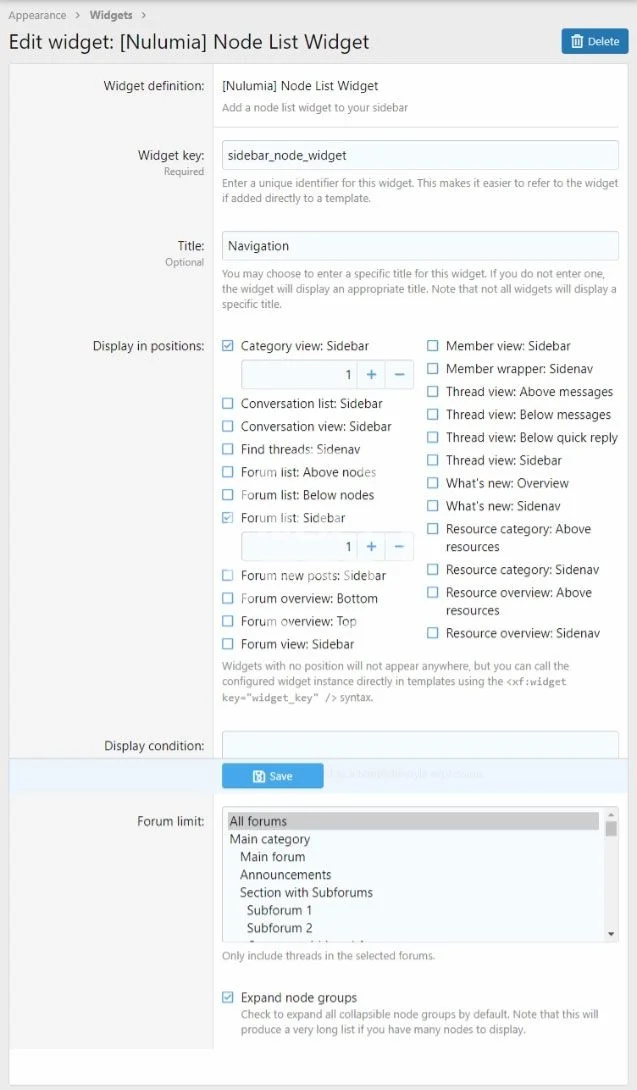 A handy Xenforo 2 widget for displaying nodes in your sidebar. Choose which nodes to display on a per-widget basis. Respects each node's setting for "Display in the node list", and user(group) permissions, a unique feature over other similar available addons.