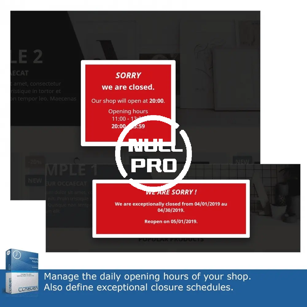 This module allows you to quickly inform your customers about the working hours of your store by displaying a message in a pop-up window. You can also define periods of exceptional closures if you wish. In case of closing, navigation on your store is blocked.