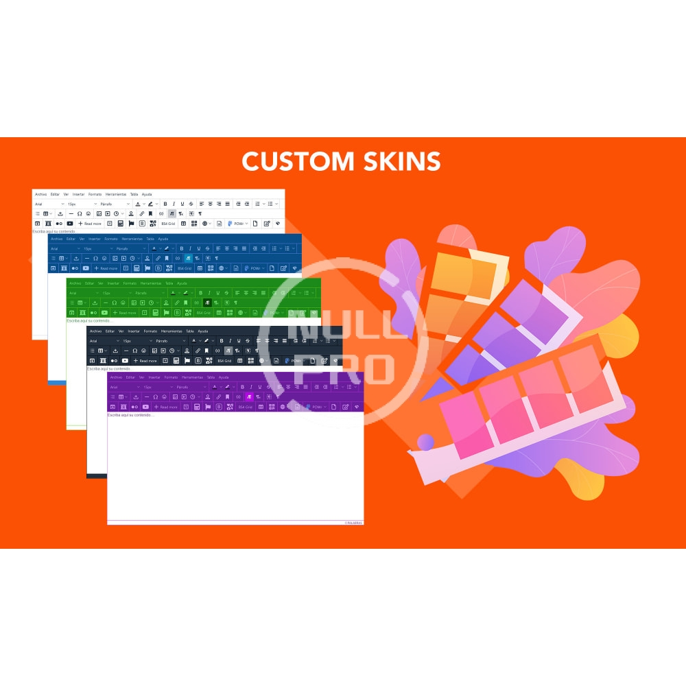 - Various skins available for the editor. Custom skins can be created.