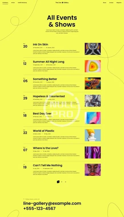 The Line Gallery is perfect for galleries, museums or any other art related websites where you can display exhibitions or events and showcase workshops and artists. It's built with the YOOtheme Pro page builder.