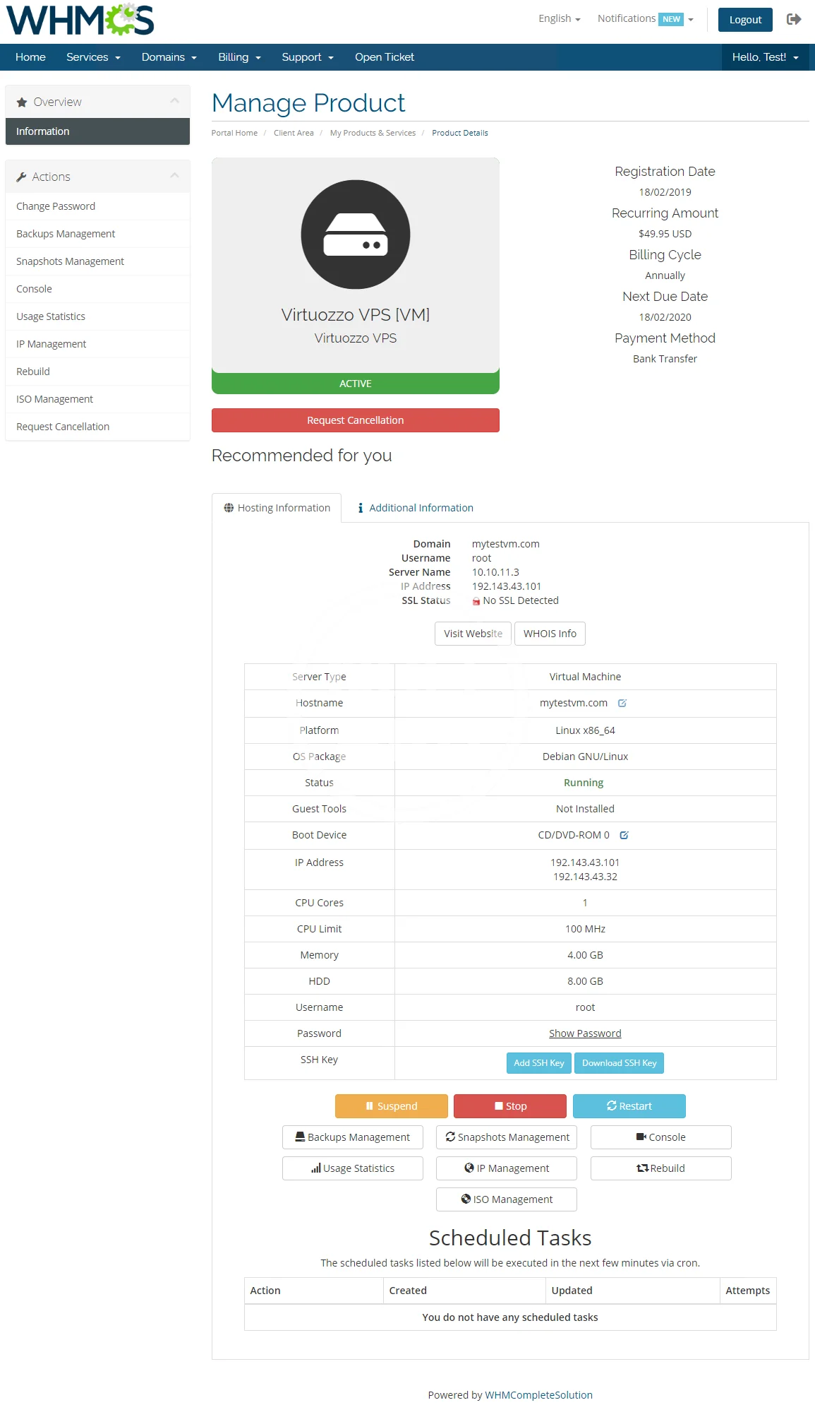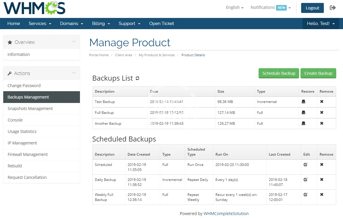 From now on, your admin area will be equipped with every tool that is essential to oversee the offered servers. At the same time, your customers will appreciate a great many means to conveniently manage their products without leaving your website. They will be empowered to control backups, snapshots, firewall, usage statistics, IP addresses, as well as access the noVNC console.