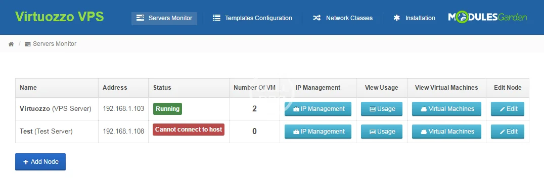 ModulesGarden Virtuozzo VPS For WHMCS is an inventive module that brings automatic provisioning and remote handling of Virtuozzo servers right into your WHMCS. With it, you will not only easily create and deliver all-ready products to your clients, but also view and manage the existing virtual machines and nodes thanks to the inbuilt Servers Monitor component.