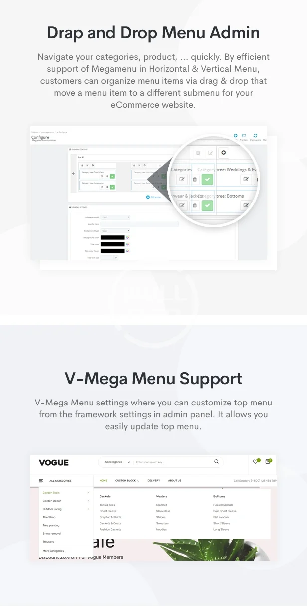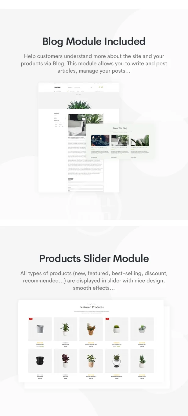 Vogue is a Prestashop Theme for any online shop such as plant, garden, farm, flower, garden plants,.... Vogue theme comes with 4 home page layouts with fully responsive, clean and elegant design.
