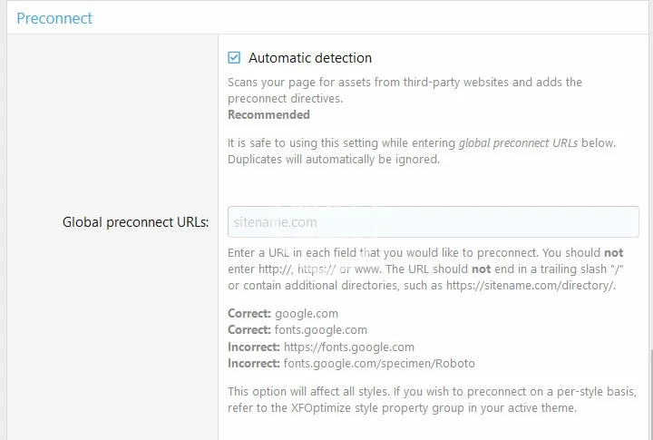 A: While we have faith in XFOptimize to get the job done, you can disable automatic detection and use the "Global preconnect resources" option either in Admin -> Options -> [Nulumia] XFOptimize, or set preconnect URLs on a per-style basis in style properties!